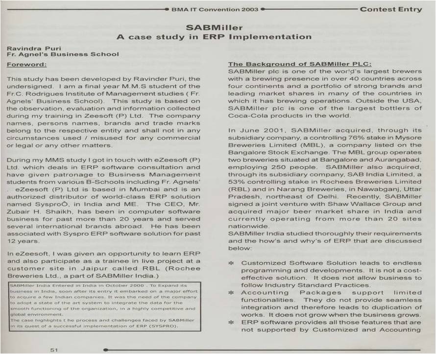 The case highlights the process and challenges faced by SABMiller in successfully implementation of ERP (SYSPRO).